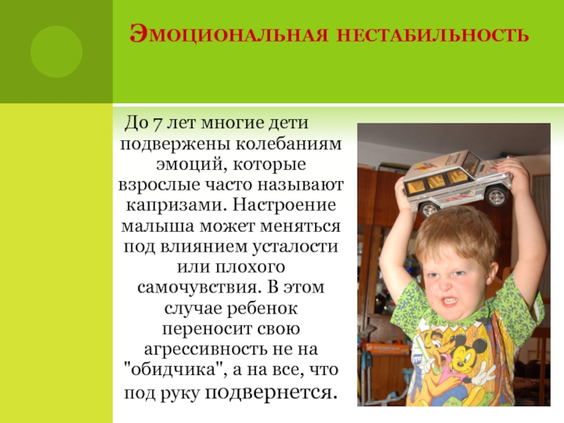 часто называют капризами. Настроение малыша может меняться под влиянием усталости или плохого самочувствия. В этом случае ребенок переносит свою агрессивность не на "обидчика", а на все, что под руку подвернется.