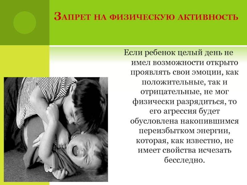 проявлять свои эмоции, как положительные, так и отрицательные, не мог физически разрядиться, то его агрессия будет обусловлена накопившимся переизбытком энергии, которая, как известно, не имеет свойства исчезать бесследно.