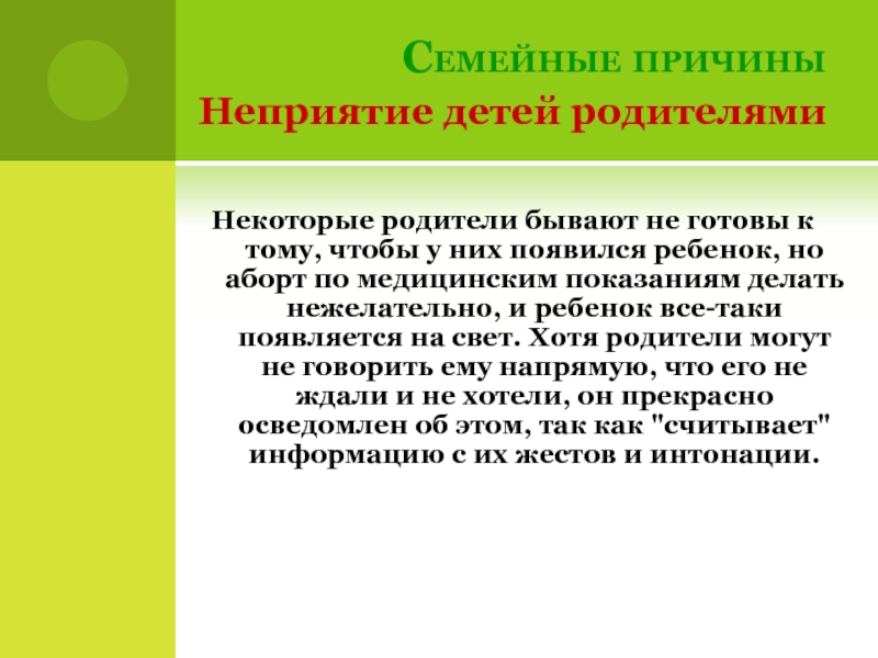 у них появился ребенок, но аборт по медицинским показаниям делать нежелательно, и ребенок все-таки появляется на свет. Хотя родители могут не говорить ему напрямую, что его не ждали и не хотели, он прекрасно осведомлен об этом, так как "считывает" информацию с их жестов и интонации.