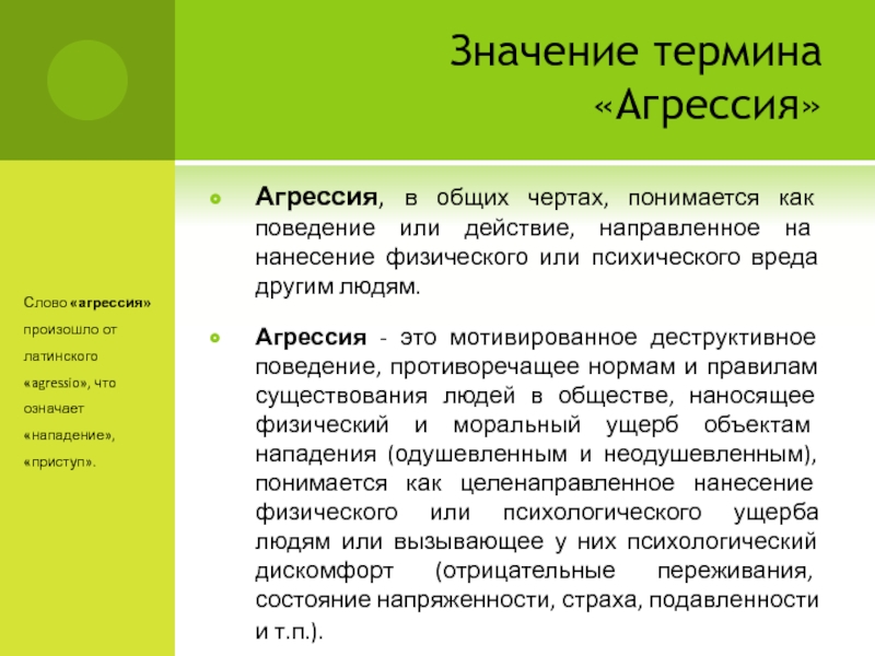 Слово «агрессия» произошло от латинского «agressio», что означает «нападение», «приступ».