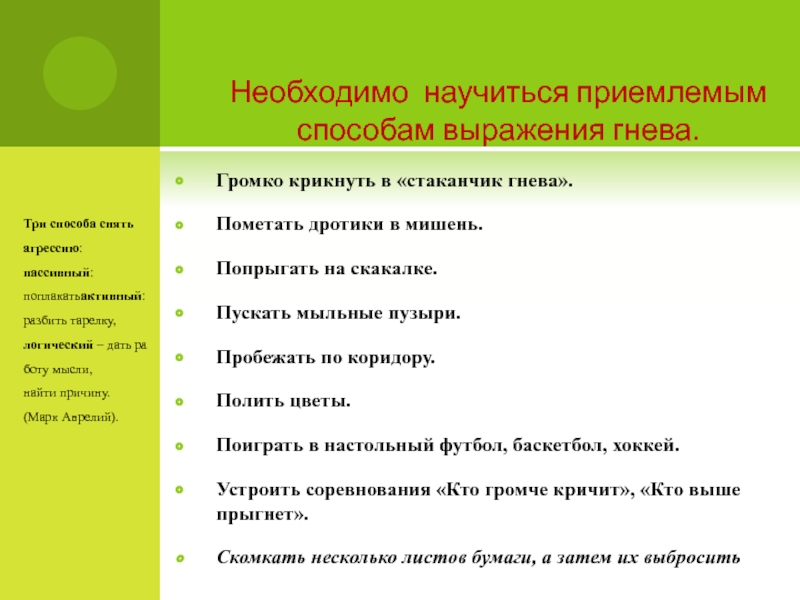 Три способа снять агрессию: пассивный:поплакатьактивный:разбить тарелку, логический – дать работу мысли, найти причину. (Марк Аврелий).