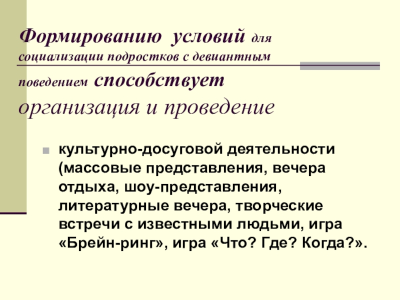 Формированию условий для социализации подростков с девиантным поведением способствует организация и