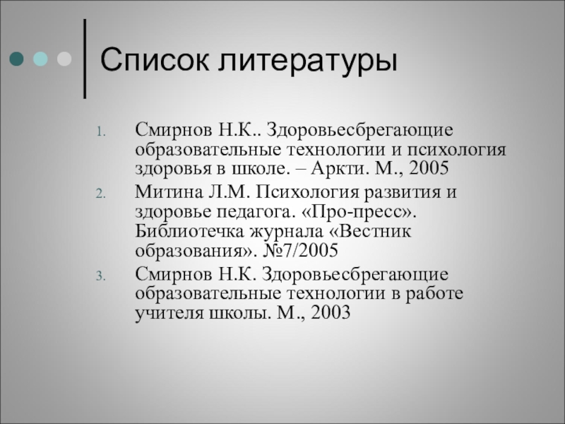 Смирнов Н.К. Здоровьесбрегающие образовательные технологии в работе учителя школы. М., 2003