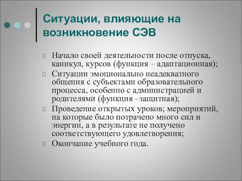 Слайд 14Ситуации, влияющие на возникновение СЭВ