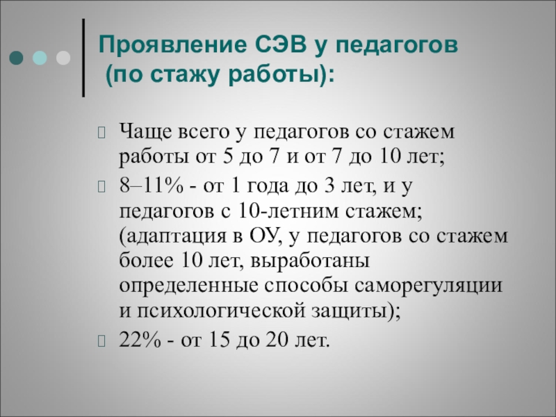 8–11% - от 1 года до 3 лет, и у педагогов с 10-летним стажем; (адаптация в ОУ, у педагогов со стажем более 10 лет, выработаны определенные способы саморегуляции и психологической защиты);