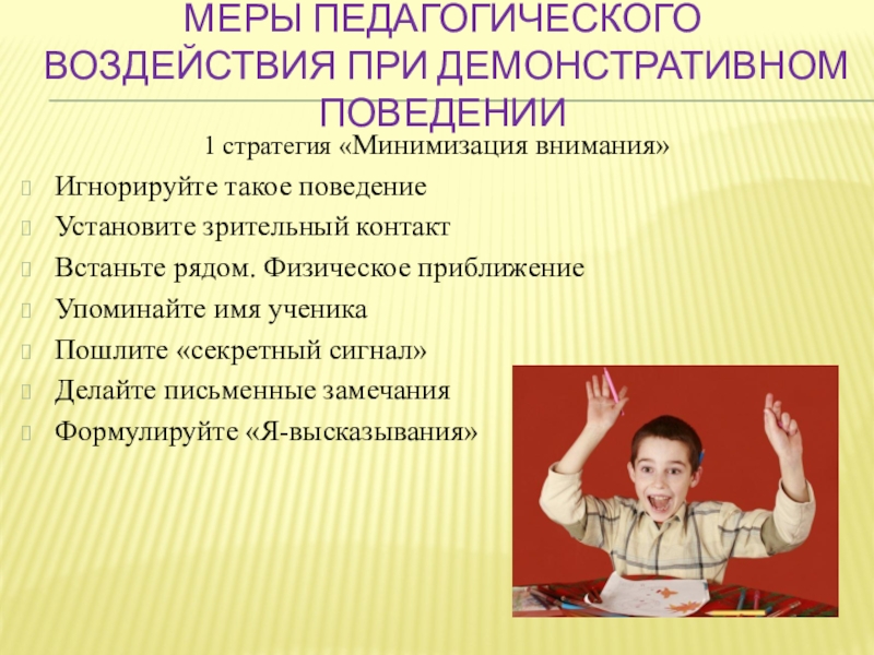 Слайд 31Меры педагогического воздействия при демонстративном поведении