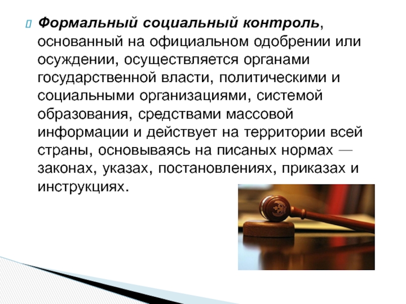 Слайд 11Формальный социальный контроль, основанный на официальном одобрении или осуждении, осуществляется органами