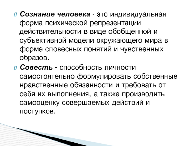 Слайд 14Сознание человека - это индивидуальная форма психической репрезентации действительности в виде обобщенной и