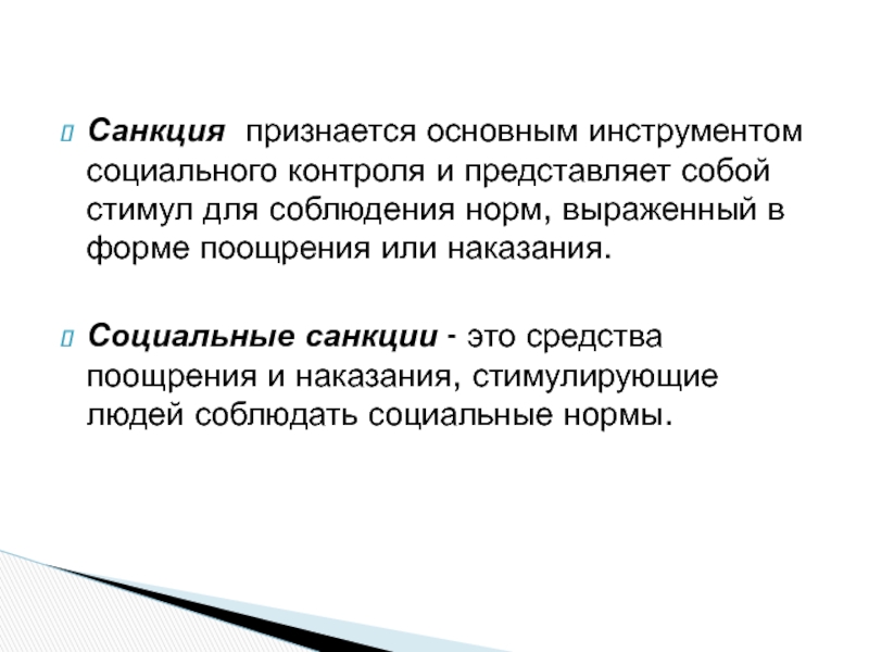 Слайд 7Санкция признается основным инструментом социального контроля и представляет собой стимул для