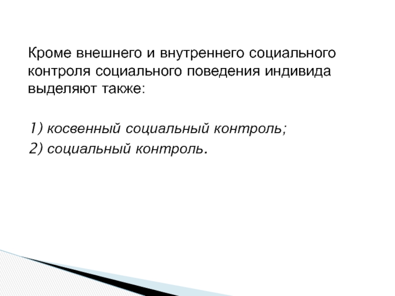 Слайд 16Кроме внешнего и внутреннего социального контроля социального поведения индивида выделяют также: