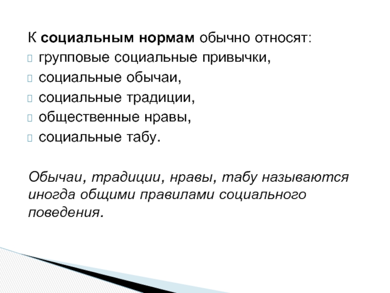 это социально одобряемые или законодательно закрепленные правила, стандарты, образцы, регулирующие социальное поведение людей. Поэтому социальные нормы разделяют на правовые нормы, нормы морали и собственно социальные нормы.