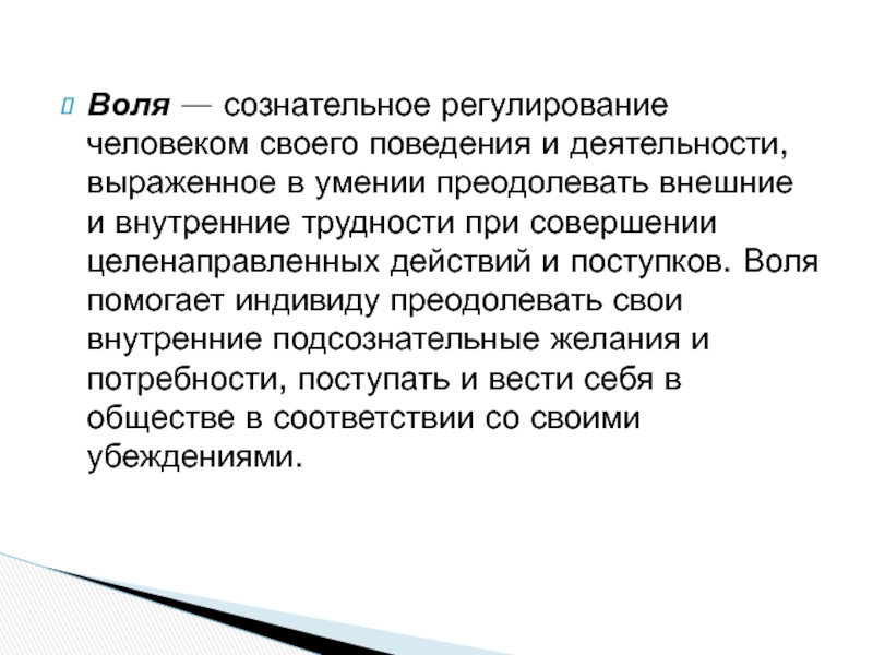 преодолевать внешние и внутренние трудности при совершении целенаправленных действий и поступков. Воля помогает индивиду преодолевать свои внутренние подсознательные желания и потребности, поступать и вести себя в обществе в соответствии со своими убеждениями.