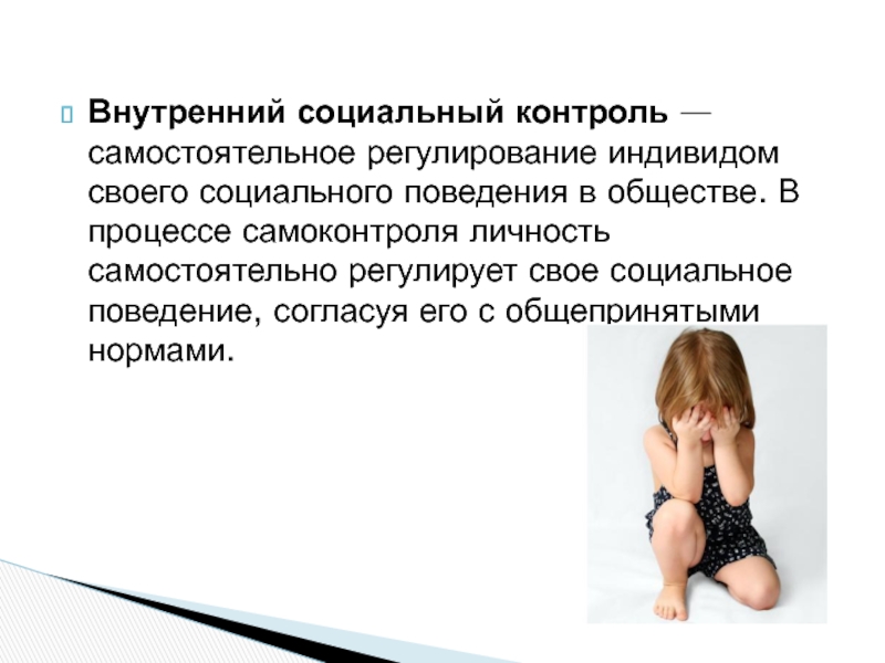 Слайд 13Внутренний социальный контроль — самостоятельное регулирование индивидом своего социального поведения в обществе.