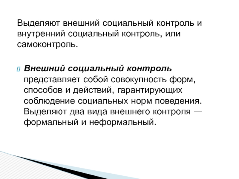 Слайд 10Выделяют внешний социальный контроль и внутренний социальный контроль, или самоконтроль.