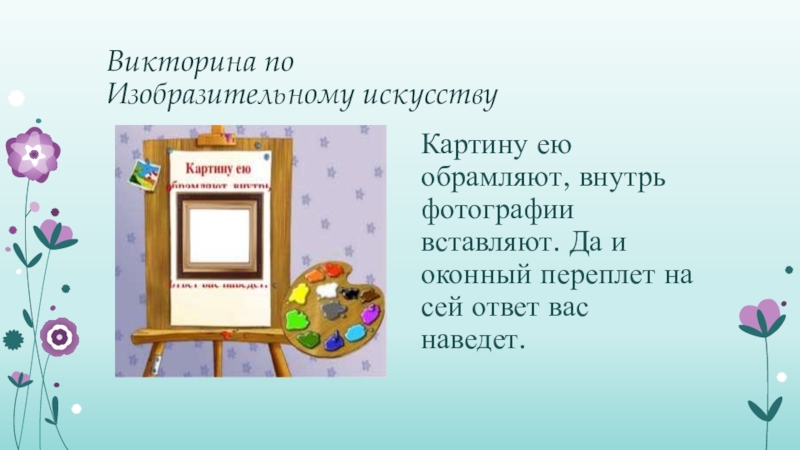 Викторина по  Изобразительному искусствуКартину ею обрамляют, внутрь фотографии вставляют. Да и оконный переплет на сей ответ