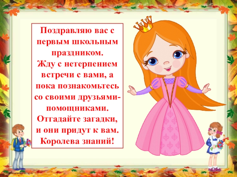 а пока познакомьтесь со своими друзьями-помощниками. Отгадайте загадки, и они придут к вам. Королева знаний!