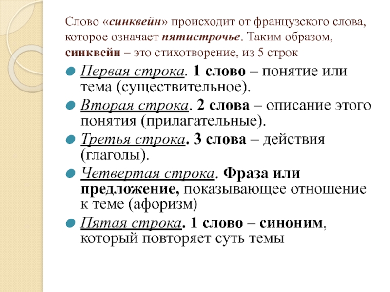 Пятая строка. 1 слово – синоним, который повторяет суть темы