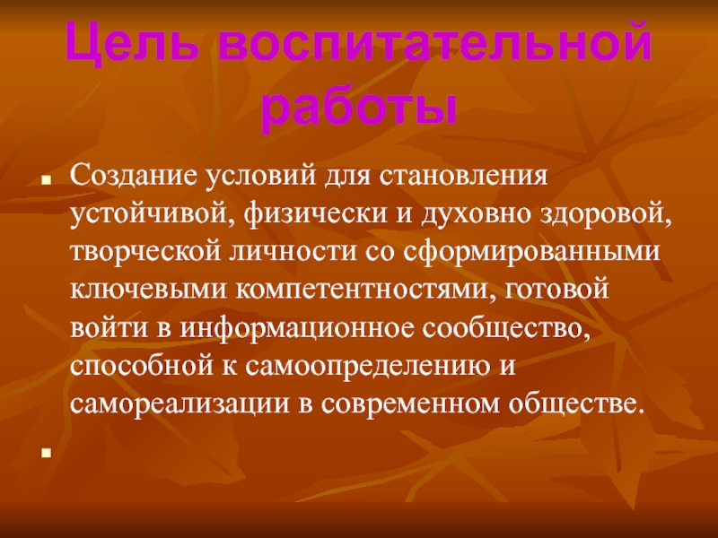 Цель воспитательной работыСоздание условий для становления устойчивой, физически и духовно здоровой, творческой личности со сформированными ключевыми компетентностями, готовой
