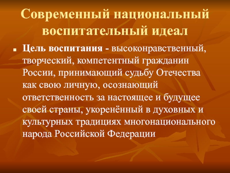 Современный национальный воспитательный идеал Цель воспитания - высоконравственный, творческий, компетентный гражданин России, принимающий судьбу Отечества как свою