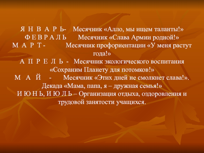 таланты!» Ф Е В Р А Л Ь Месячник «Слава Армии родной!» М А Р Т - Месячник профориентации «У меня растут года!» А П Р Е Л Ь - Месячник экологического воспитания «Сохраним Планету для потомков!» М А Й - Месячник «Этих дней не смолкнет слава!». Декада «Мама, папа, я – дружная семья!» И Ю Н Ь, И Ю Л Ь – Организация отдыха, оздоровления и трудовой занятости учащихся.