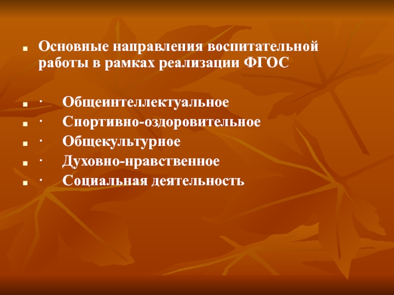 Основные направления воспитательной работы в рамках реализации ФГОС·   Общеинтеллектуальное ·   Спортивно-оздоровительное·