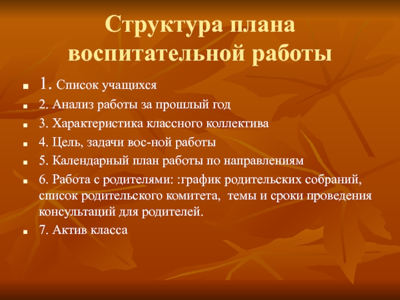 Структура плана воспитательной работы1. Список учащихся2. Анализ работы за прошлый год3. Характеристика классного коллектива4. Цель, задачи вос-ной