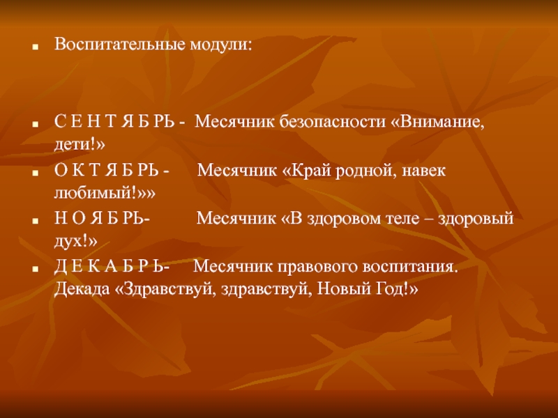 Воспитательные модули:С Е Н Т Я Б РЬ - Месячник безопасности «Внимание, дети!»О К Т Я Б