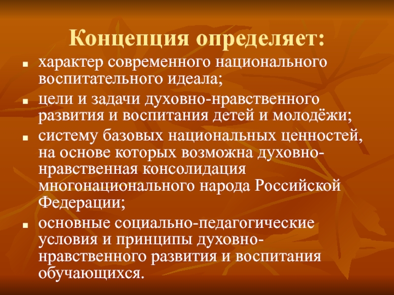 Концепция определяет: характер современного национального воспитательного идеала;цели и задачи духовно-нравственного развития и воспитания детей и молодёжи;систему базовых