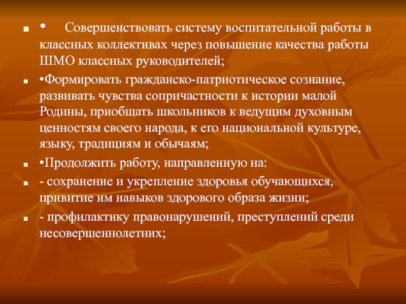 •	Совершенствовать систему воспитательной работы в классных коллективах через повышение качества работы ШМО классных руководителей; •	Формировать гражданско-патриотическое сознание,
