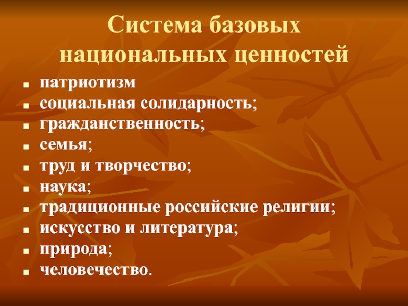 Система базовых национальных ценностей патриотизм социальная солидарность;гражданственность;семья;труд и творчество;наука;традиционные российские религии; искусство и литература;природа;человечество.