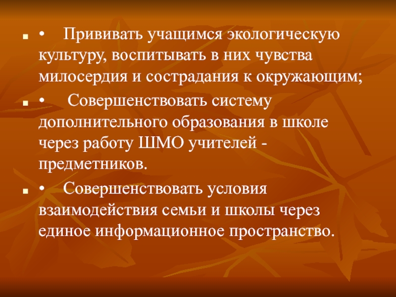 •	Прививать учащимся экологическую культуру, воспитывать в них чувства милосердия и сострадания к окружающим;•	 Совершенствовать систему дополнительного образования