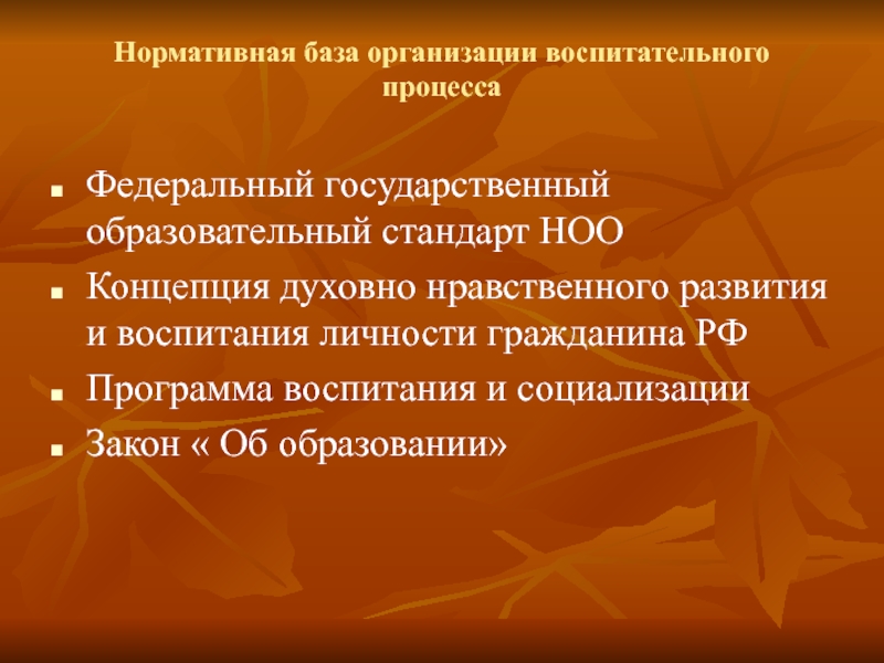 Нормативная база организации воспитательного процессаФедеральный государственный образовательный стандарт НООКонцепция духовно нравственного развития и воспитания личности гражданина РФПрограмма воспитания и социализации Закон « Об образовании»