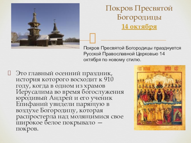 Покров Пресвятой Богородицы празднуется Русской Православной Церковью 14 октября по новому стилю.