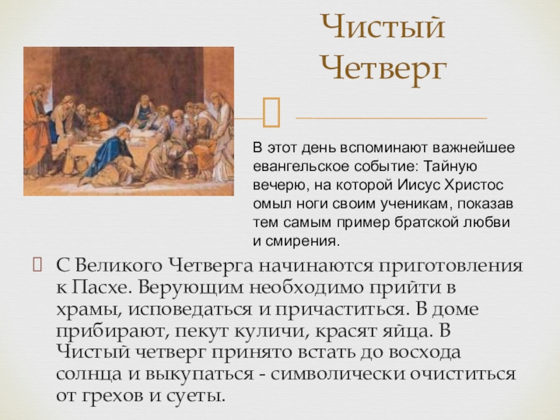 В этот день вспоминают важнейшее евангельское событие: Тайную вечерю, на которой Иисус Христос омыл ноги своим ученикам, показав тем самым пример братской любви и смирения.