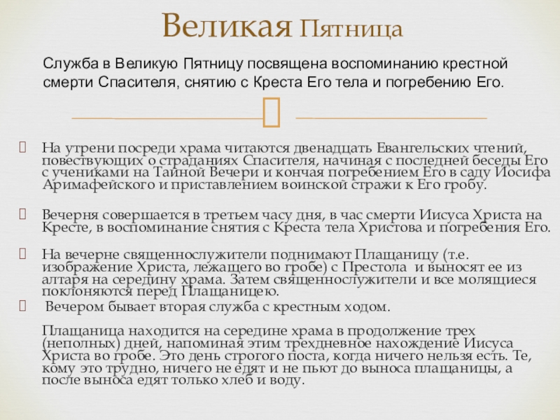 Служба в Великую Пятницу посвящена воспоминанию крестной смерти Спасителя, снятию с Креста Его тела и погребению Его.