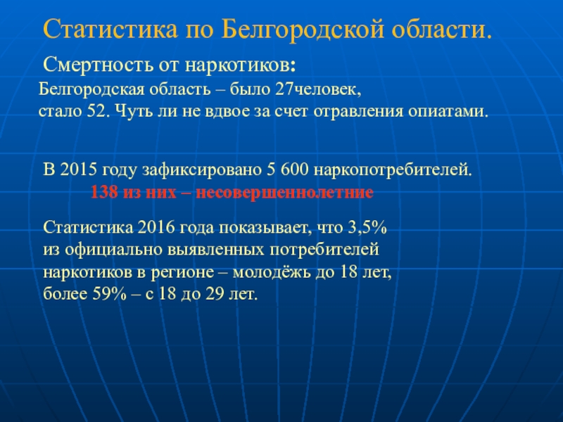 Статистика 2016 года показывает, что 3,5% из официально выявленных потребителей наркотиков в регионе – молодёжь до 18 лет, более 59% – с 18 до 29 лет.