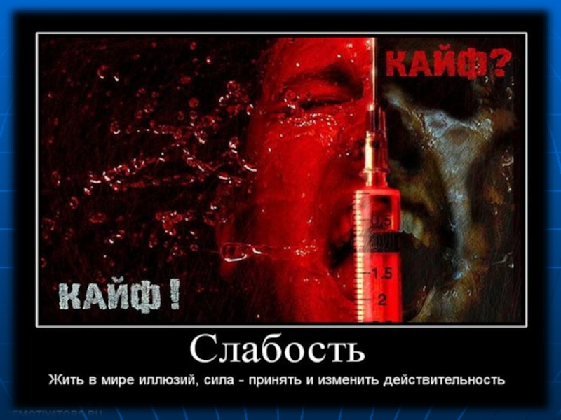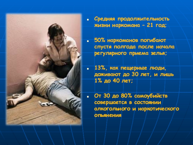 Слайд 10Средняя продолжительность жизни наркомана – 21 год;