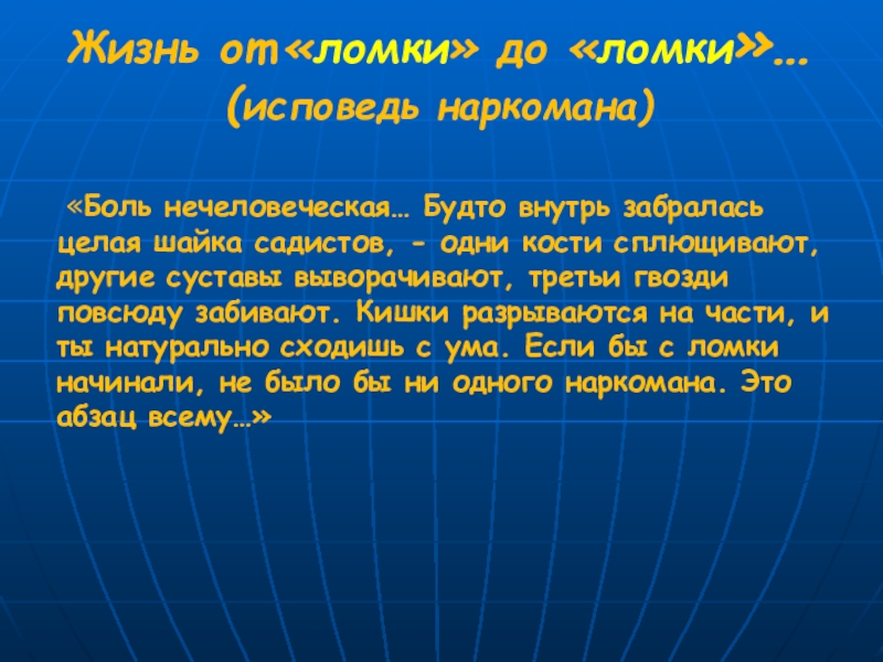 забралась целая шайка садистов, - одни кости сплющивают, другие суставы выворачивают, третьи гвозди повсюду забивают. Кишки разрываются на части, и ты натурально сходишь с ума. Если бы с ломки начинали, не было бы ни одного наркомана. Это абзац всему…»