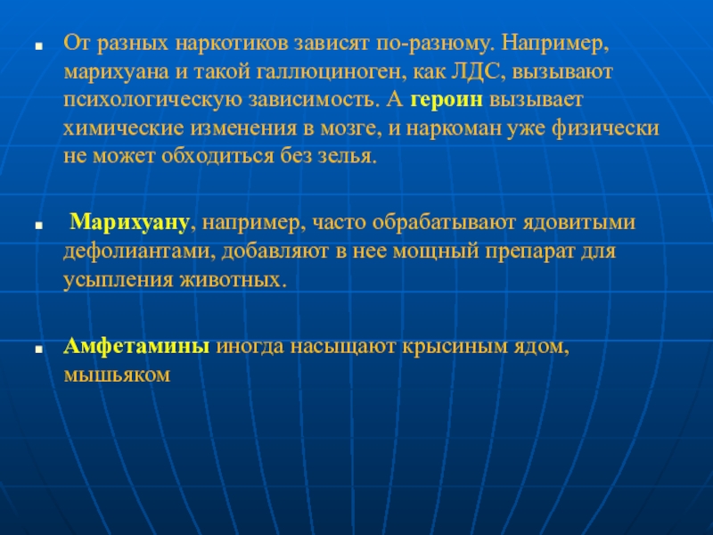 Слайд 8От разных наркотиков зависят по-разному. Например, марихуана и такой галлюциноген, как