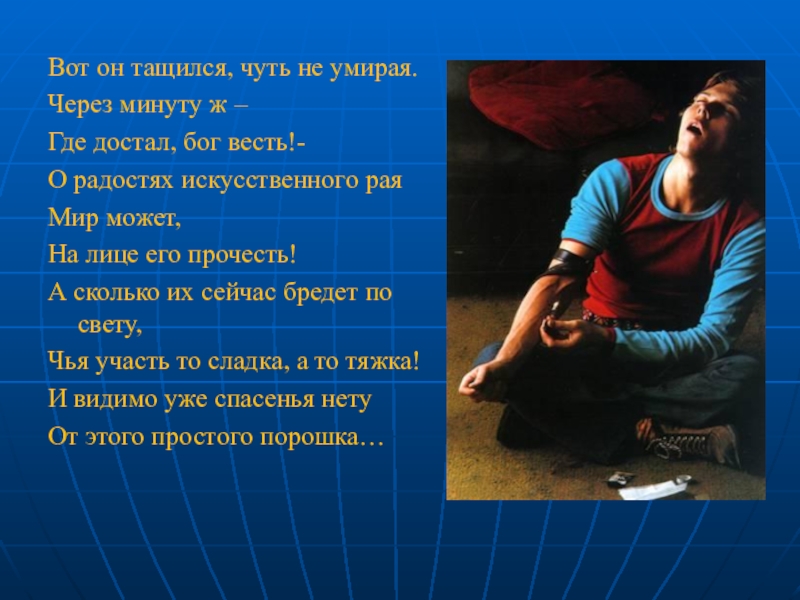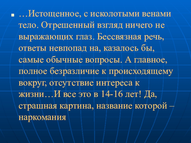 Слайд 2…Истощенное, с исколотыми венами тело. Отрешенный взгляд ничего не выражающих глаз.