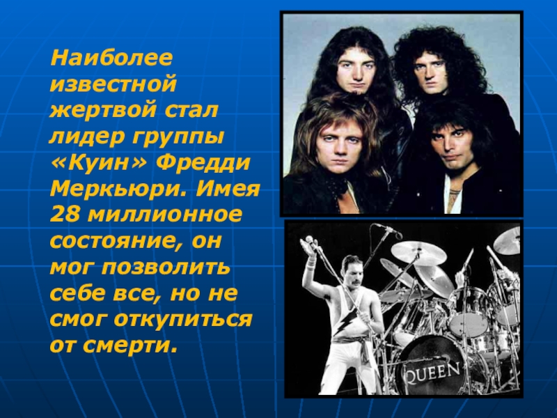 Слайд 12 Наиболее известной жертвой стал лидер группы «Куин» Фредди Меркьюри.