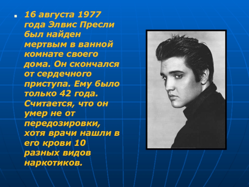Слайд 1316 августа 1977 года Элвис Пресли был найден мертвым в ванной
