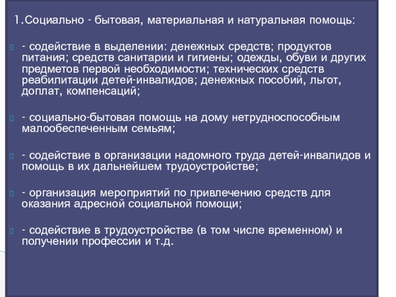денежных средств; продуктов питания; средств санитарии и гигиены; одежды, обуви и других предметов первой необходимости; технических средств реабилитации детей-инвалидов; денежных пособий, льгот, доплат, компенсаций;