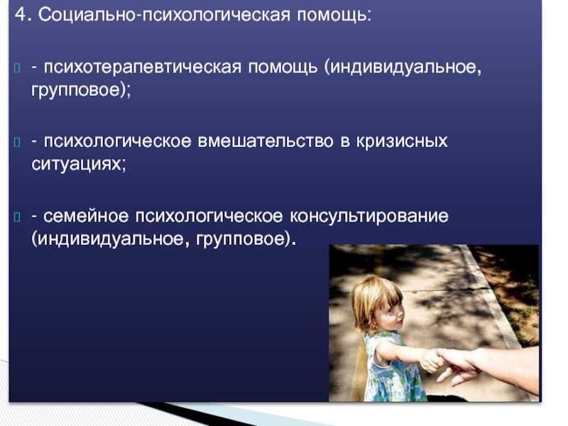 - психотерапевтическая помощь (индивидуальное, групповое);