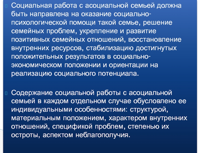 Содержание социальной работы с асоциальной семьей в каждом отдельном случае обусловлено ее индивидуальными особенностями: структурой, материальным положением, характером внутренних отношений, спецификой проблем, степенью их остроты, аспектом неблагополучия.