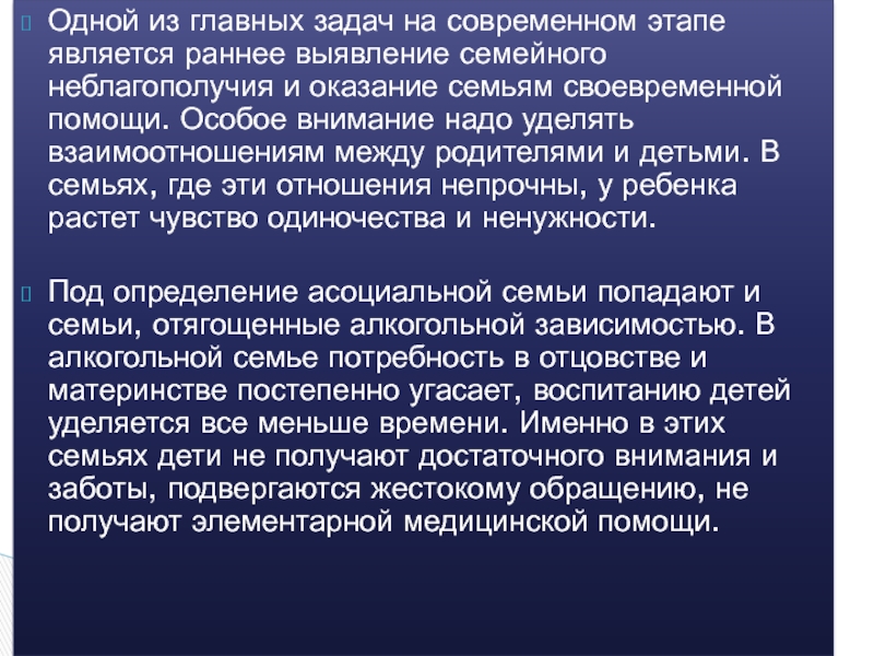 Под определение асоциальной семьи попадают и семьи, отягощенные алкогольной зависимостью. В алкогольной семье потребность в отцовстве и материнстве постепенно угасает, воспитанию детей уделяется все меньше времени. Именно в этих семьях дети не получают достаточного внимания и заботы, подвергаются жестокому обращению, не получают элементарной медицинской помощи.