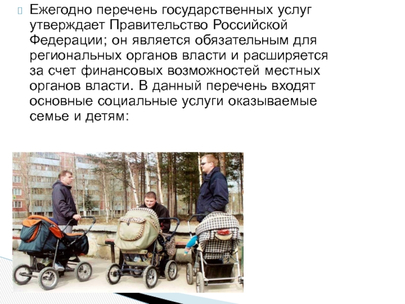 для региональных органов власти и расширяется за счет финансовых возможностей местных органов власти. В данный перечень входят основные социальные услуги оказываемые семье и детям: