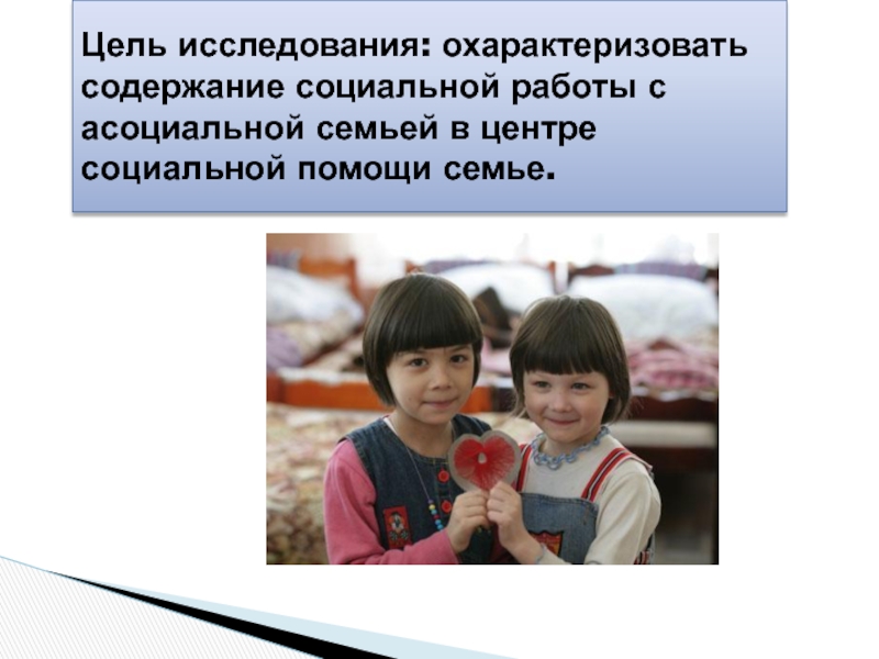 Цель исследования: охарактеризовать содержание социальной работы с асоциальной семьей в центре