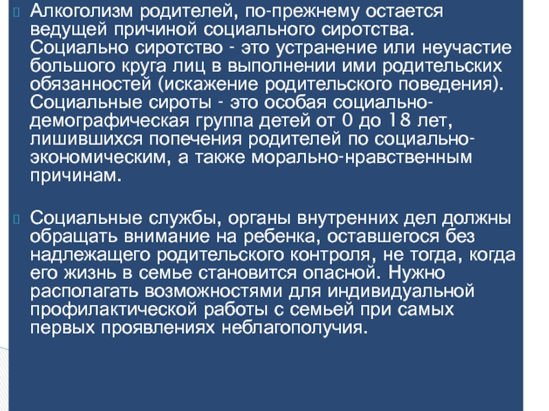 Слайд 10Алкоголизм родителей, по-прежнему остается ведущей причиной социального сиротства. Социально сиротство -