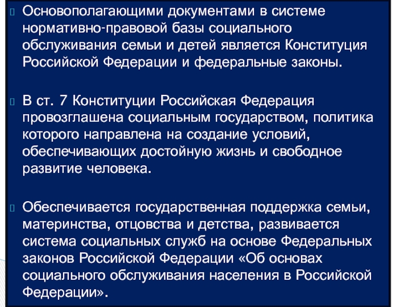 Слайд 14Основополагающими документами в системе нормативно-правовой базы социального обслуживания семьи и детей